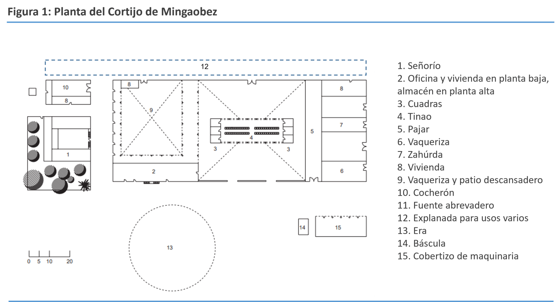 To the left of the following image appears the construction intended for offices, warehouse and housing, in the center the tinao can be seen and to the right the haystack and the warehouse for machinery close to the era.